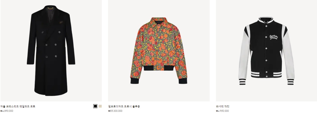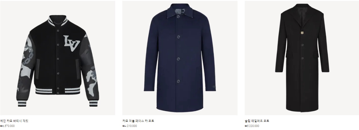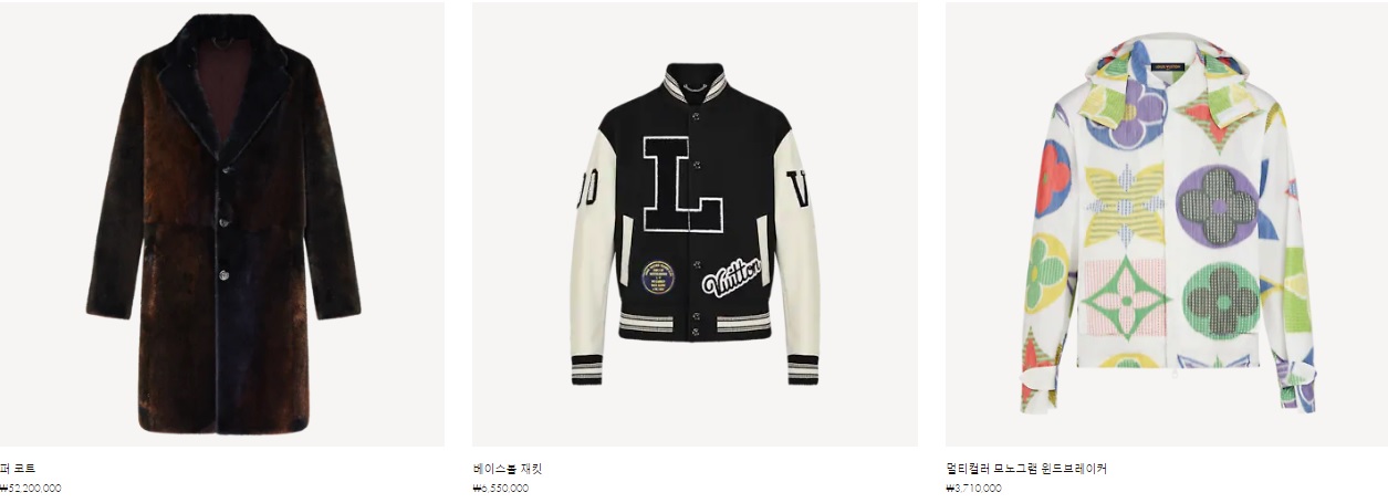 퍼 코트 ₩52,200,000 베이스볼 재킷 ₩6,550,000 멀티컬러 모노그램 윈드브레이커 ₩3,710,000