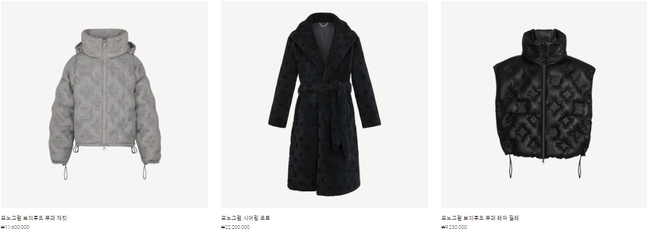 모노그램 보이후드 푸퍼 재킷 ₩11,600,000 모노그램 시어링 코트 ₩22,200,000 모노그램 보이후드 푸퍼 레더 질레 ₩9,230,000