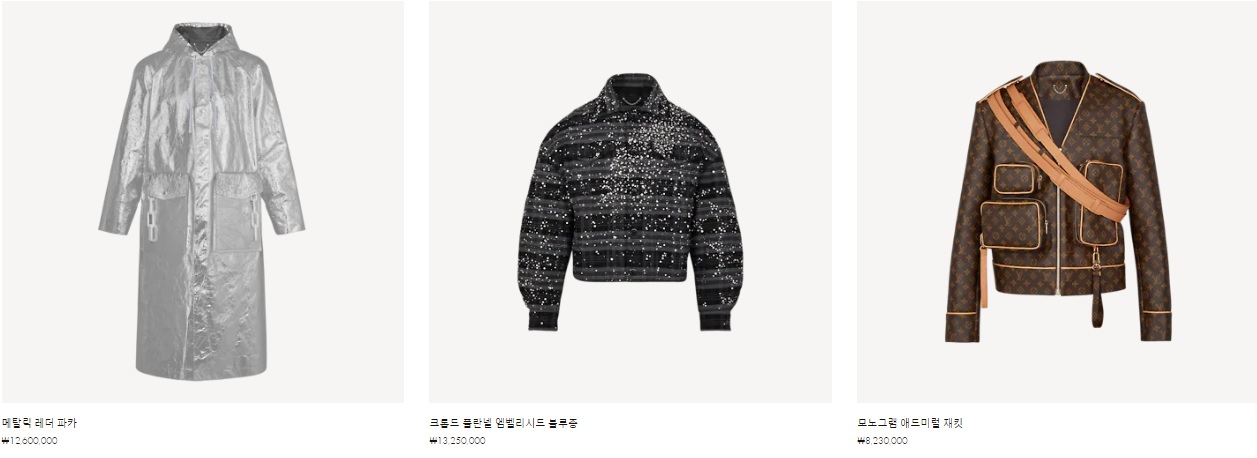 메탈릭 레더 파카 ₩12,600,000 크롭드 플란넬 엠벨리시드 블루종 ₩13,250,000 모노그램 애드미럴 재킷 ₩8,230,000