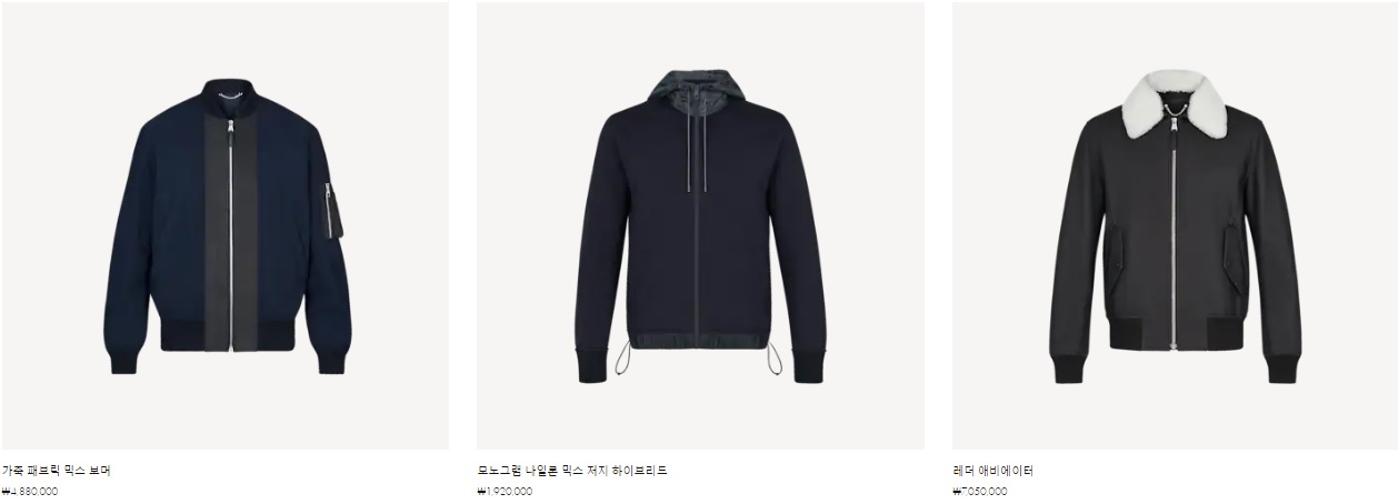 가죽 패브릭 믹스 보머 ₩4,880,000 모노그램 나일론 믹스 저지 하이브리드 ₩1,920,000 레더 애비에이터 ₩7,050,000