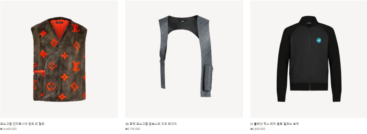 모노그램 인따르시아 밍크 퍼 질레 ₩16,600,000 3D 포켓 모노그램 엠보스드 미드 레이어 ₩3,190,000 LV 플래닛 믹스 레더 푼토 밀라노 보머 ₩2,850,000