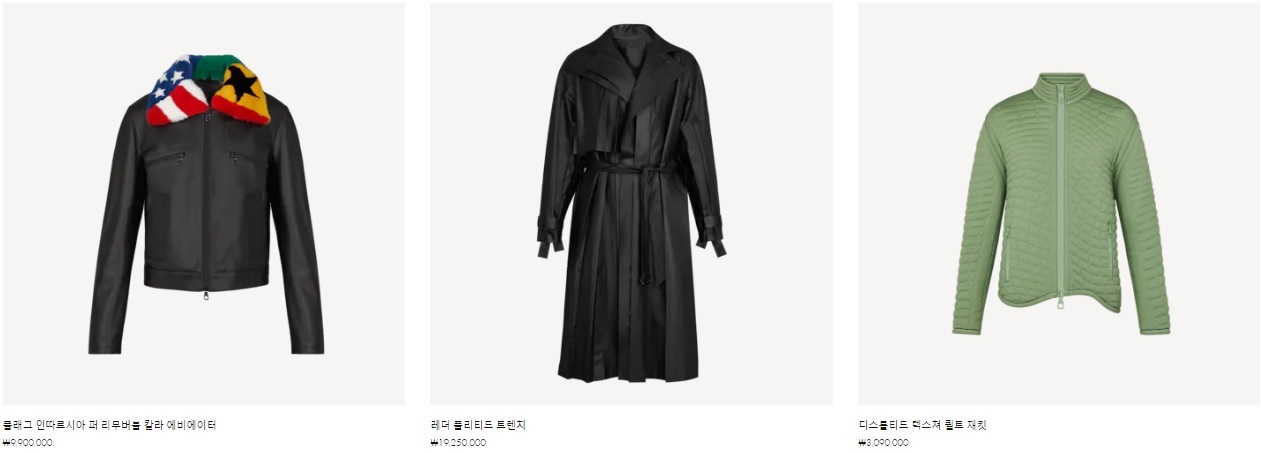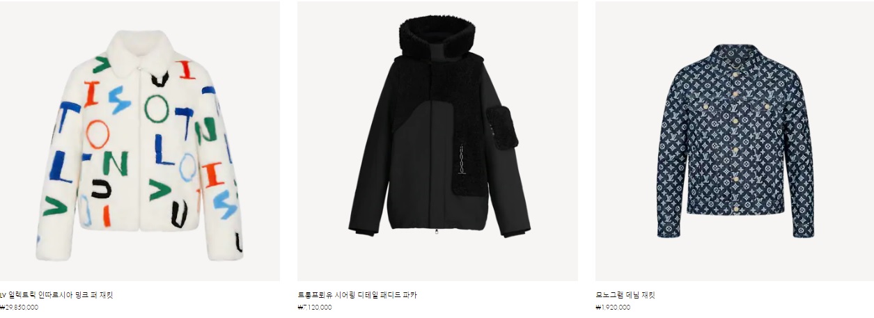 LV 일렉트릭 인따르시아 밍크 퍼 재킷 ₩29,850,000 트롱프뢰유 시어링 디테일 패디드 파카 ₩7,120,000 모노그램 데님 재킷 ₩1,920,000