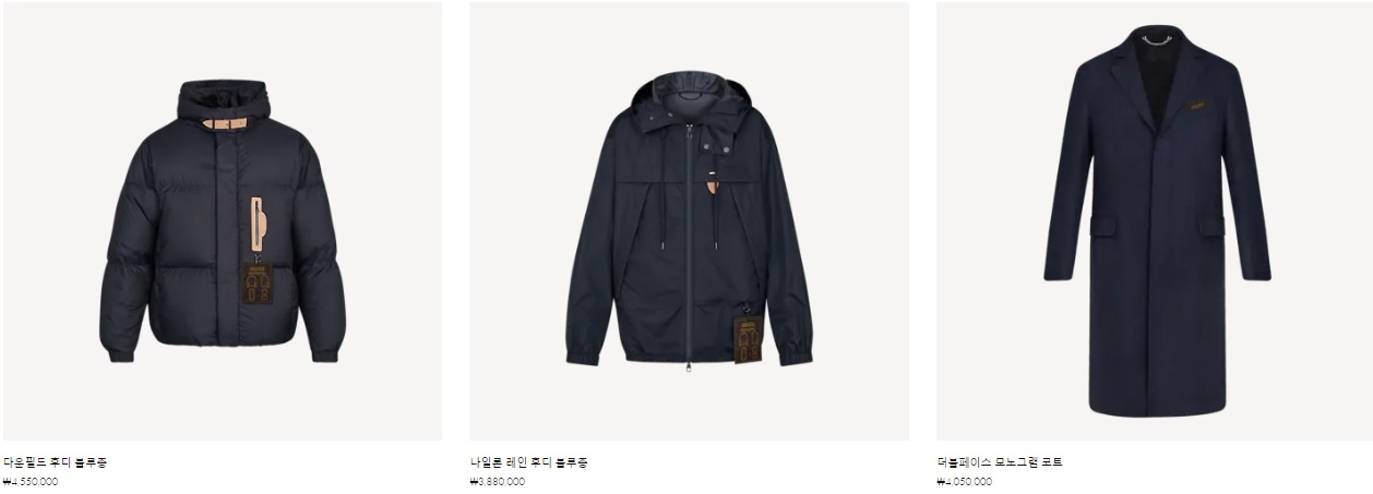 다운필드 후디 블루종 ₩4,550,000 나일론 레인 후디 블루종 ₩3,880,000 더블페이스 모노그램 코트 ₩4,050,000