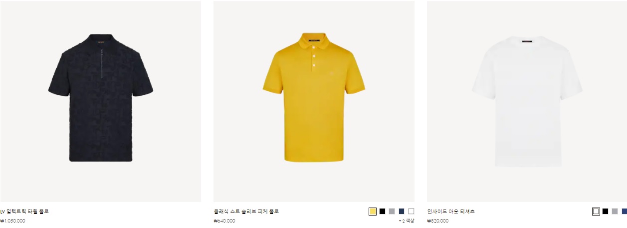 LV 일렉트릭 타월 폴로 ₩1,050,000 클래식 쇼트 슬리브 피케 폴로 ₩640,000 인사이드 아웃 티셔츠 ₩820,000
