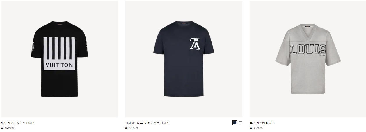 비통 바코드 & 어스 티셔츠 ₩1,090,000 업사이드다운 LV 로고 포켓 티셔츠 ₩730,000 루이 바스켓볼 셔츠 ₩1,920,000