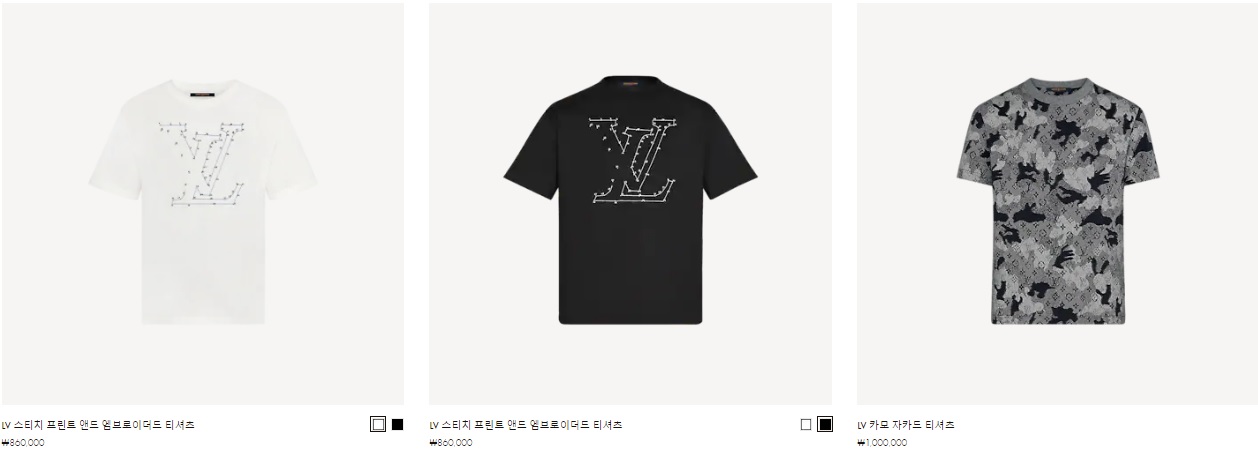 LV 스티치 프린트 앤드 엠브로이더드 티셔츠 ₩860,000 LV 스티치 프린트 앤드 엠브로이더드 티셔츠 ₩860,000 LV 카모 자카드 티셔츠 ₩1,000,000