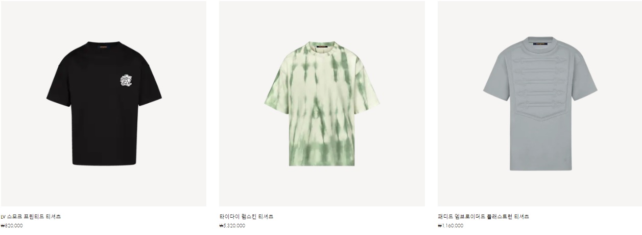 LV 스모크 프린티드 티셔츠 ₩820,000 타이다이 램스킨 티셔츠 ₩5,320,000 패디드 엠브로이더드 플래스트런 티셔츠 ₩1,160,000