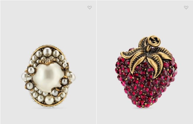 글래스 펄 디테일의 플라워 반지 ₩ 650,000 크리스털 디테일의 스트로베리 반지 ₩ 670,000