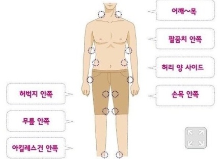 펄스 포인트는 어깨~목, 팔꿈치 안쪽, 허리 양 사이드, 손목 안쪽, 허벅지 안쪽, 무릎 안쪽, 아킬레스 건 안쪽