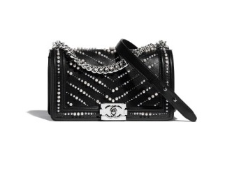 보이 샤넬 스몰 플랩 백 카프스킨, 스터드, 스트라스, 루테늄 메탈 ₩7,440,000