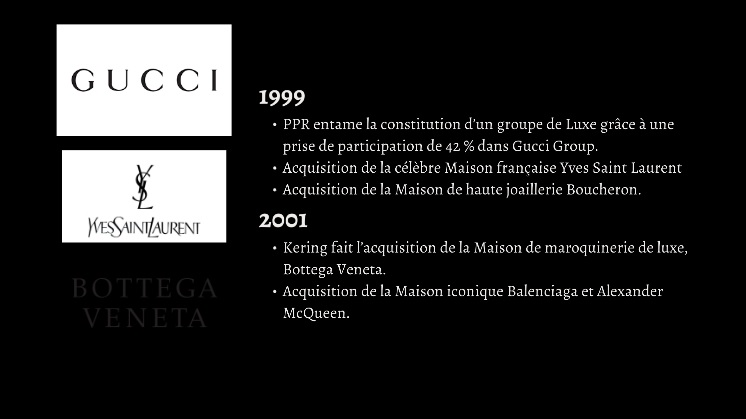 - 럭셔리 부문에 투자 (1999년 Sergio Rossi 인수, 2000년 Boucheron, Bottega Veneta 인수, 2001년 Balenciaga 인수, Stella McCartney 및 Alexander McQueen과 전략적 파트너십이 체결, 2011년 Girard-Perregaux 및 JeanRichard, 2012 년 Qeelin (en) 및 Brioni, 2012 년 Christopher Kane (en), Pomellato (en) 및 Tomas Maier). 2001년 Pinault-Printemps-Redoute는 Citadium 매장을 시작하고 Surcouf 브랜드를 인수했습니다.