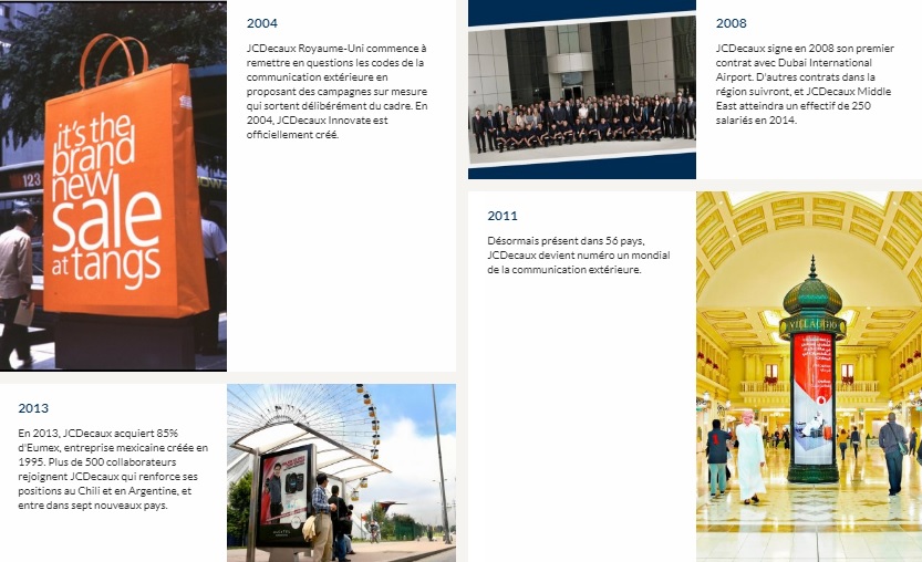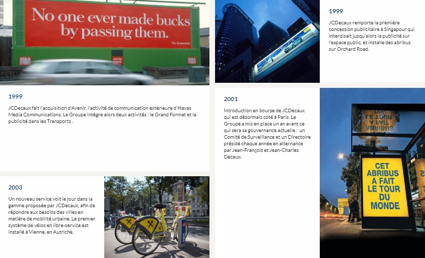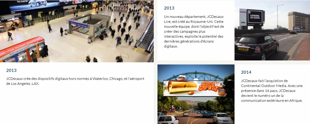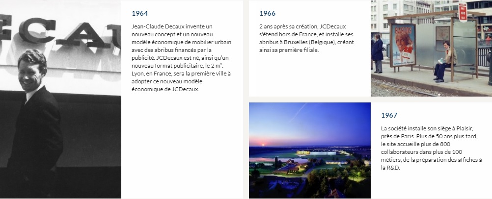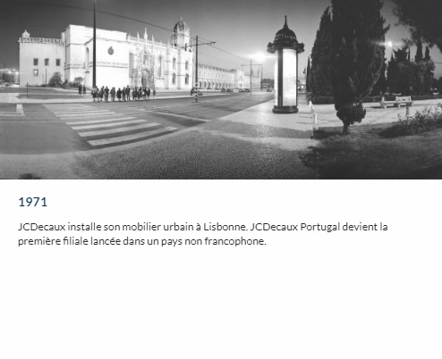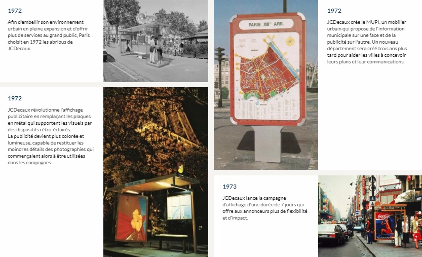 1970년대 회사는 면적이 2m2 인 최초의 거리 가구 (MUPI)와 8m2의 광고 패널 인 "시니어"를 개발했습니다. JCDecaux는 이후 Morris Columns에서 Fermiere (affermage) 회사를 인수했습니다.