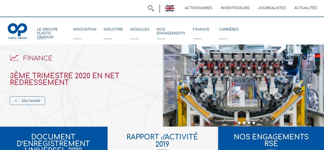 Plastic Omnium은 플라스틱 제조 및 상용화를 전문으로하는 프랑스 자동차 공급 업체입니다. 2019년 매출 92억 유로를 기록한 이 그룹은 전 세계 131개 공장, 26개 R & D 센터 및 26개국에서 32,000 명의 직원을 고용하고 있습니다. Plastic Omnium은 Next 150 및 CAC Mid 60 지수로 파리 증권 거래소에 상장되어 있습니다.